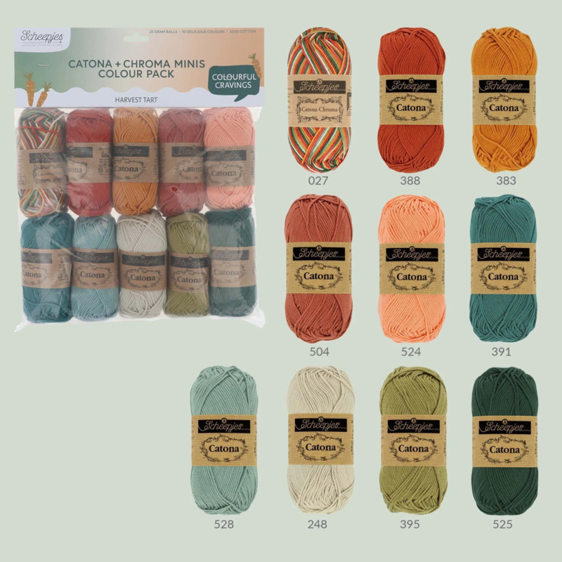 De Harvest Tart colourpack bevat de volgende kleurnummers: Catona 388, 383, 504, 524, 391, 528, 248, 395 en 525 en Catona Chroma 027